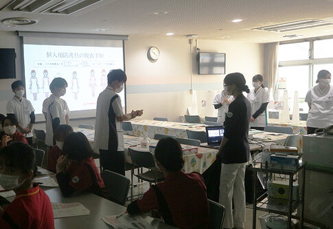 リハ科の新人研修では、診療報酬や感染予防、体位変換・移乗などの起居動作の研修、電子カルテの操作方法、リスク管理などを学び、実体験をすることで患者さんへの配慮や知識、技術の向上心が高まる研修となりました。
