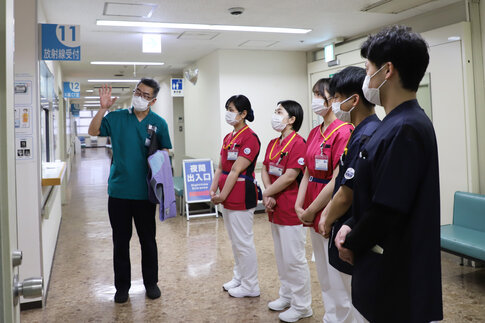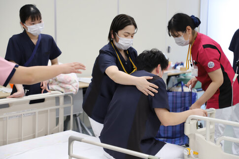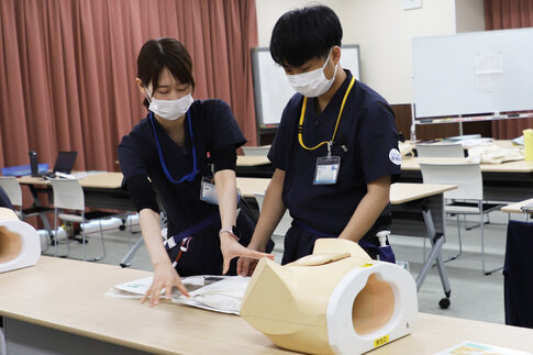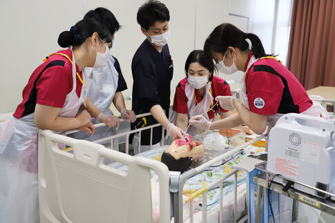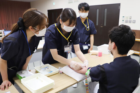 人体模型を用いた実習では、実際の患者さんに対応することを想定し、処置の前に声かけを行う姿が印象的でした。