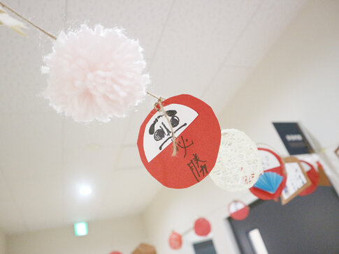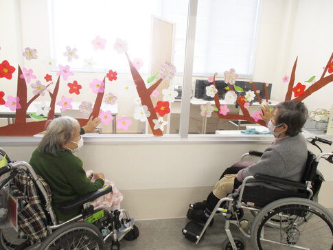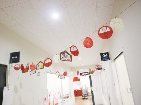 現在リハビリテーションセンター内の廊下である「コミュニケーションロード」に患者さんが1月から作成をはじめた、梅の花の壁画やだるまや絵馬を飾っています。