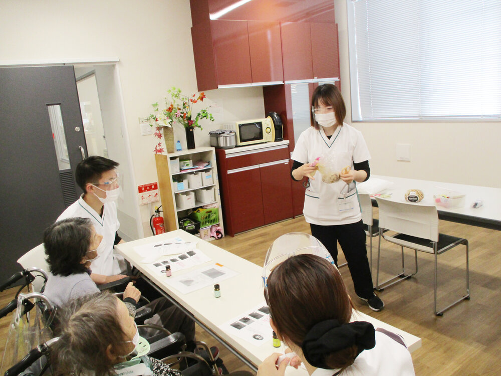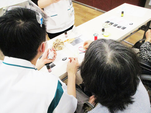 ラベンダー、レモングラス、ペパーミント、スイートオレンジの中から各々好きなにおいを選び、綿に染み込ませて、とってもいい匂いの匂い袋ができました。