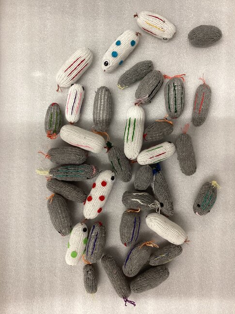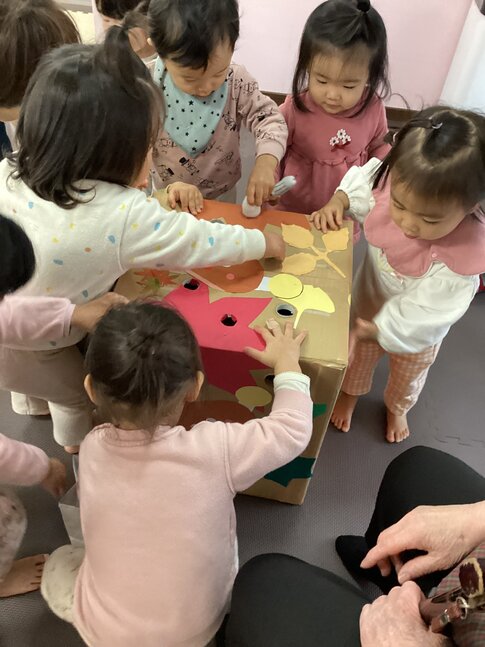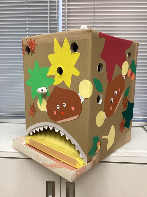 裁縫が得意な利用者さんたちがいも虫を作成してくださり、個々で違った顔のいも虫ができ、素敵な作品が完成しました。クリスマス前には保育園に利用者さんと職員でプレゼントを渡しに行き、実際に子供達が遊んでいる様子を見た利用者さんはとても喜んでいました。