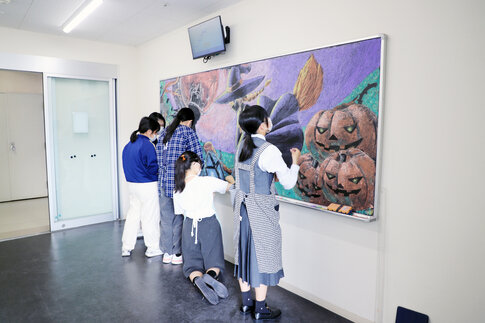 10月18日、武田高校・中学校の美術部の生徒さんたちが、当院1階渡り廊下の黒板に「ハロウィン」をテーマとした黒板アートを描いてくださいました。