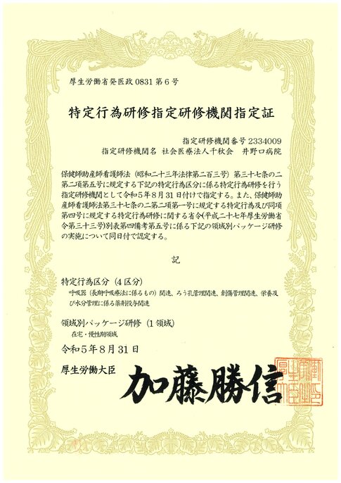 当院は厚生労働省「特定行為に係る看護師の研修制度」の研修機関に指定されており、研修機関の試験に合格した看護師が、厚生労働省令に基づき実習を行っております。