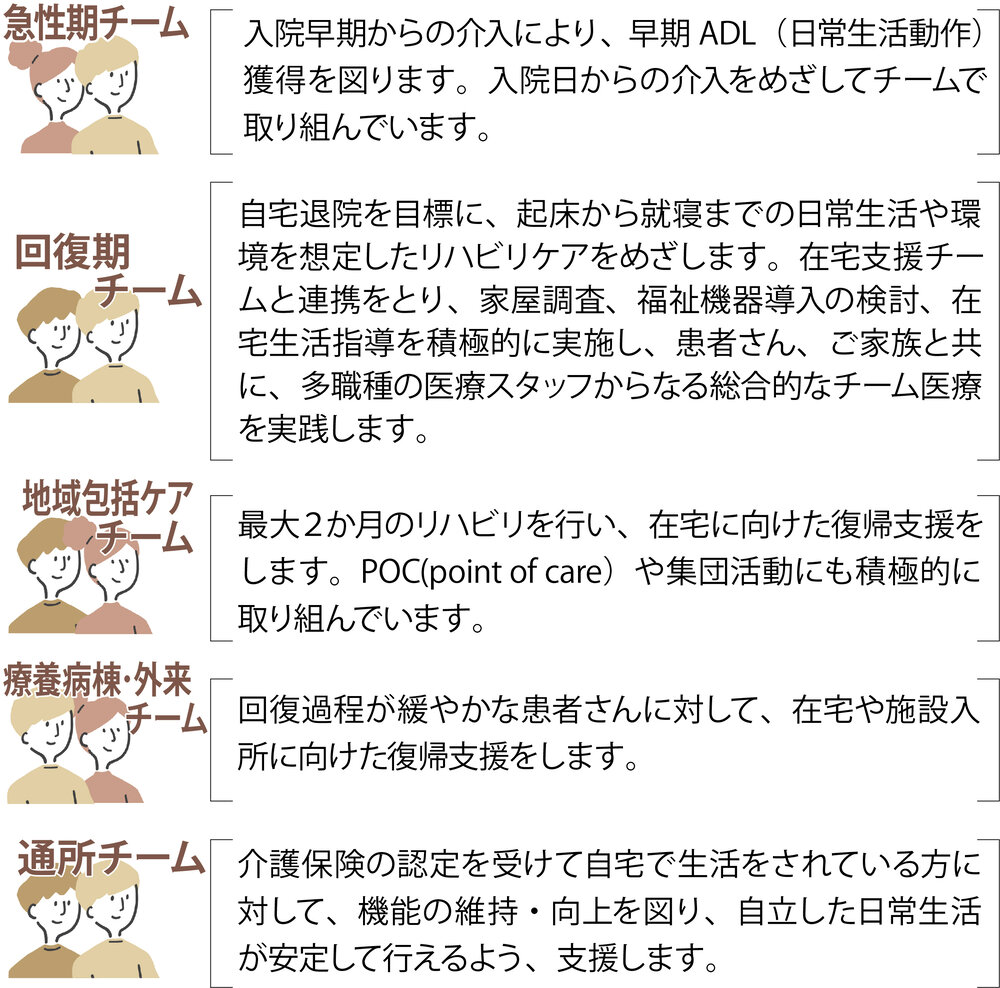 つの病棟がそれぞれ異なる機能を持っています。その病棟の特性に合ったリハビリテーションを提供するために、病棟チーム制を取り入れています。